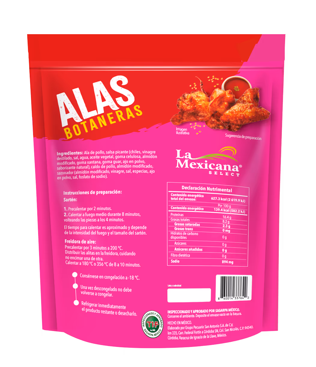 Trozos de alitas de pollo, salsa picante (mezcla de chiles, vinagre, sal, agua, aceite de soja, condimentos, especias, saborizantes y conservadores).