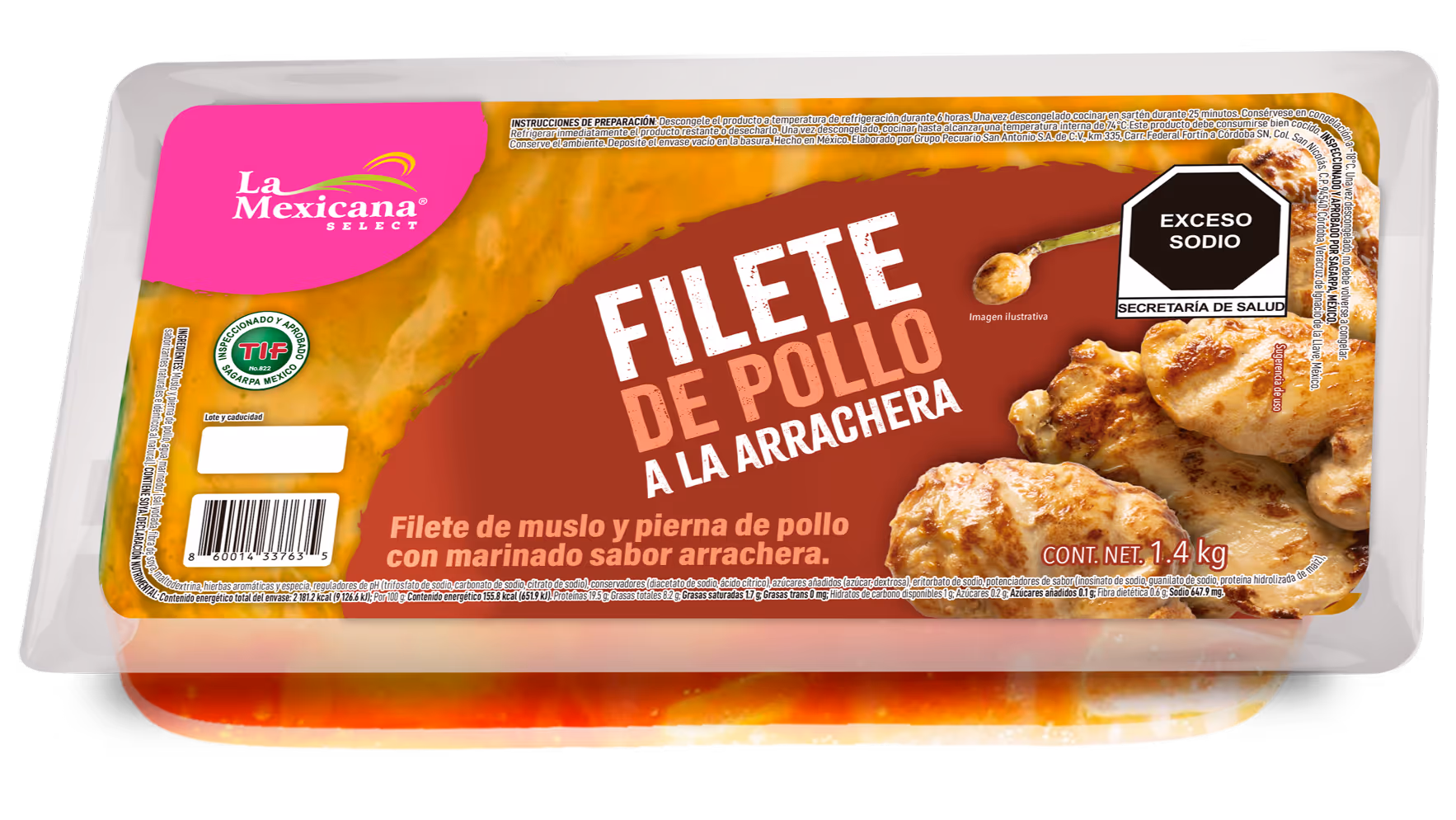 Filete pierna y muslo de pollo pigmentado o blanco, agua y marinador ranchero (mezcla de chiles, sal yodada, harina de maíz, especias, conservadores, achiote y saborizantes.