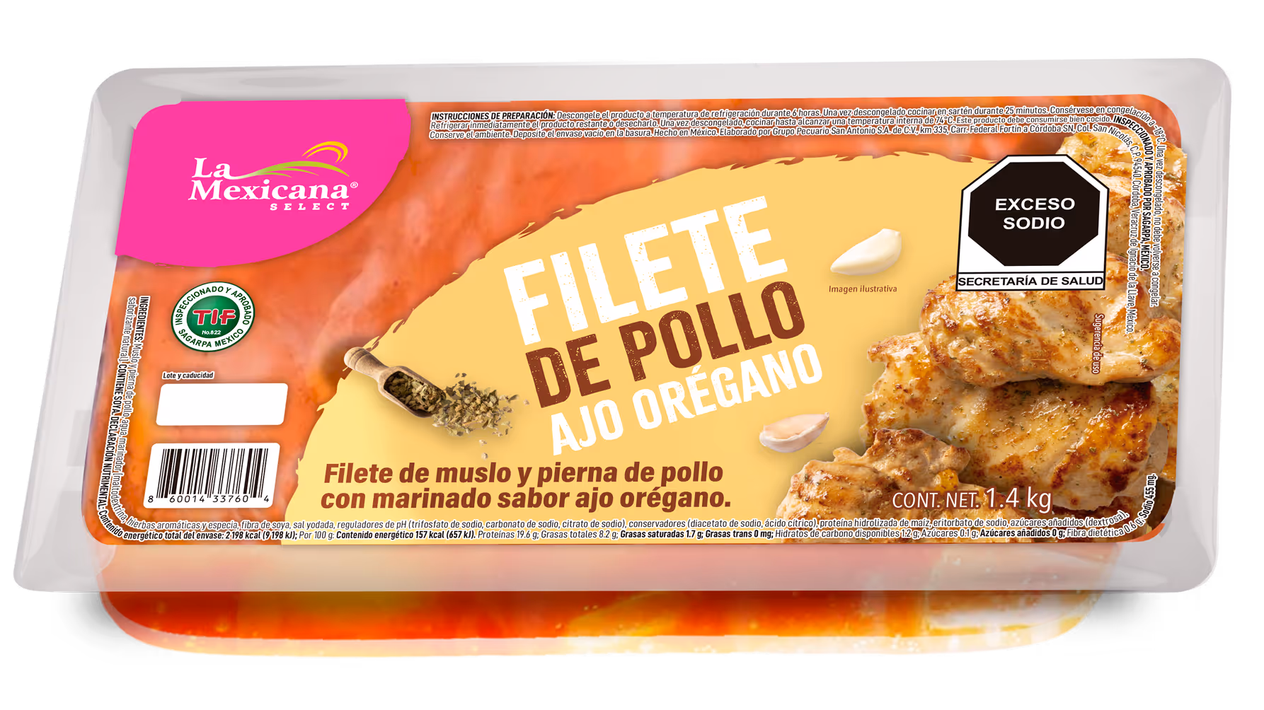 Filete pierna y muslo de pollo pigmentado o blanco, agua y marinador ajo-orégano (ajo, orégano, cebolla, perejil, pimienta negra, especias, conservador y saborizantes.